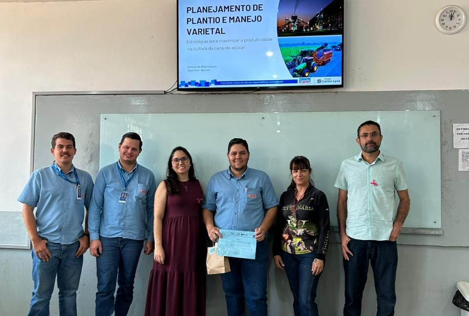 Com o tema “Planejamento de Plantio e Manejo Varietal: Estratégias para Maximizar a Produtividade na Cultura da Cana-de-Açúcar”, Deibson Souza compartilhou com os alunos do curso Técnico em Agropecuária os principais conceitos que norteiam a condução de um planejamento agrícola eficiente. Entre os tópicos abordados estiveram a importância do planejamento técnico, os pilares que sustentam as boas práticas de campo, a escolha de variedades adaptadas, as estratégias de aproveitamento do potencial genético e o manejo estratégico por ambiente, sempre com foco na produção sustentável.